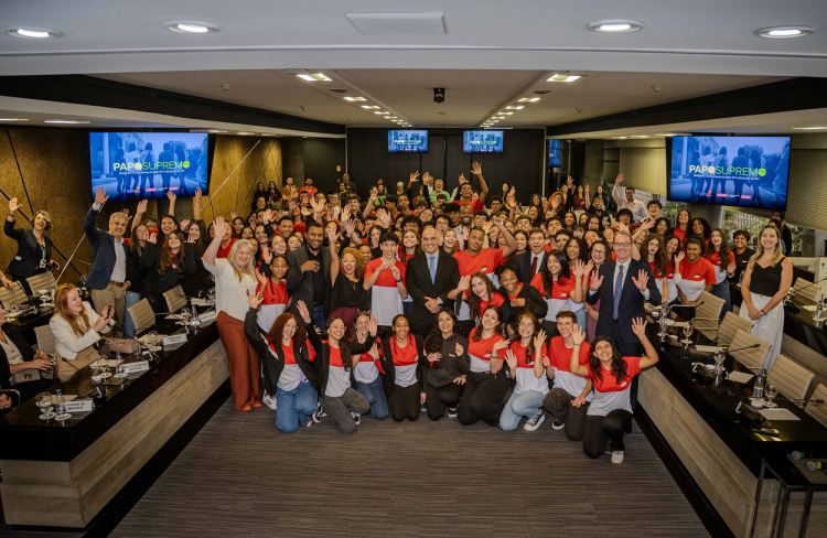 Na última sexta-feira, 4 de abril, o Sesi-SP e o Departamento Jurídico da Fiesp (Dejur) realizaram a terceira edição do projeto Papo Supremo, que promove o encontro de ministros do Supremo Tribunal Federal (STF) com estudantes do Ensino Médio Sesi/Senai-SP. Desta vez, a aula magna contou com a participação presencial dos alunos da unidade de Jundiaí, que receberam o ministro Alexandre de Moraes e apresentaram suas experiências e projetos diretamente a ele. O encontro foi transmitido ao vivo para mais de 21 mil alunos da rede em todo o estado, ampliando o alcance do diálogo.
