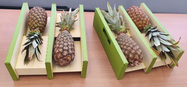 Solução: FIBAX - Uma embalagem biodegradável feita com bagaço de cana que garante a organização do transporte dos abacaxis. Além disso, a embalagem preserva seus valores e eles chegam em perfeito estado ao seu destino.