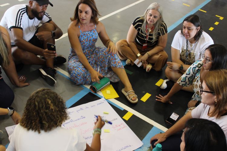 Grupo de professores durante o DiVerso em Prosa, dinâmica mediada pela Psicológa Flavia Panassi, abrindo o Saber em Ação 2024