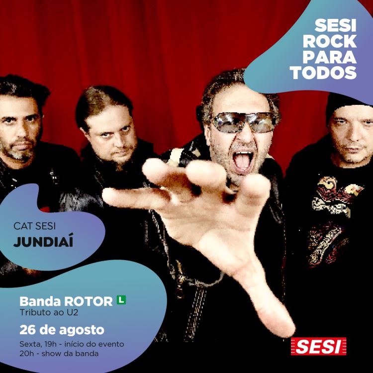 O show acontece na próxima, sexta-feira, 26 de agosto, no CAT SESI JUNDIAÍ (SESÃO), Av. Antônio Segre, 695 - Jardim Brasil, com início a partir das 19h e show da Banda Rotor Tributo U2 às 20h, entrada GRATUITA para todo o público. Quem puder e quiser, pode contribuir com a doação de 1kg de alimento não perecível que será destinado a entidades sociais.